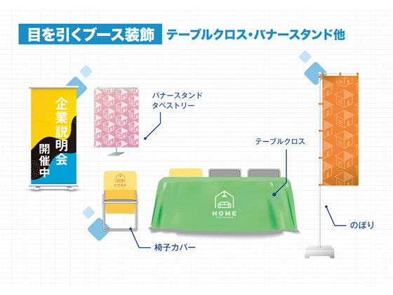 ・テーブルクロス・フロアサイン: 統一感を出すことで、ブースの完成度と信頼感がグッと高まります。