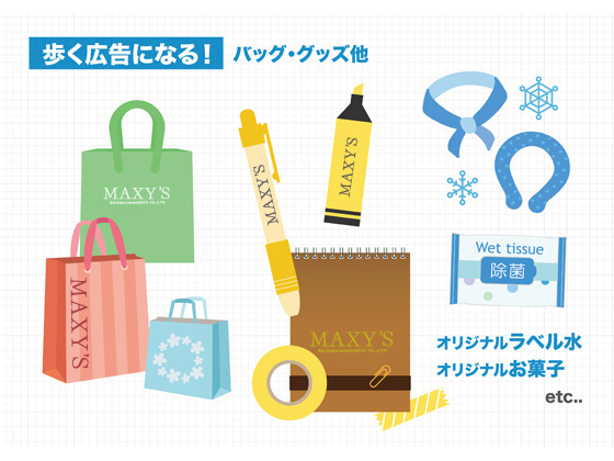 不織布バッグ、ポリエステルバッグ、綿バッグ、PVCバッグ、フェルトバッグ、合皮バッグ、保冷バッグ、ポーチ、巾着、肩ナップ、テーラーバッグ、フェイスカバー、スマホスタンド、ボールペン、メモ帳、文メモ、カレンダー、付箋、フィギュア、オリジナルタオル、タペストリー、リングノート、クリアファイル、マグネット、弁当箱、マグカップ、タンブラー、ステンレスボトル、オリジナル箸、オリジナルスプーン、オリジナルお菓子、オリジナル傘、名入れTシャツ、スマホタッチペン、スマホスタンド、防災グッズ、爪やすり、ミラー、歯ブラシ、キッチングッズ、フロッシュ 他